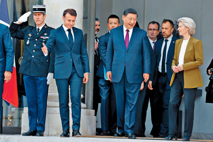 國家主席習近平昨日在巴黎同法國總統馬克龍和歐盟委員會主席馮德萊恩舉行三方會晤,呼吁中歐堅持伙伴定位,開展戰略協作,不針對、不依附、也不受制于第三方。針對歐盟正對中國電動車進行反補貼調查,習強調,中國新能源產業在開放競爭中練就了真本事,不存在所謂“產能過?!?,雙方應通過對話妥善處理經貿摩擦。馮德萊恩再次指中國電動車和鋼鐵“充斥歐洲市場”,并稱已告訴中方,歐盟準備做“保護經濟的艱難決定”。