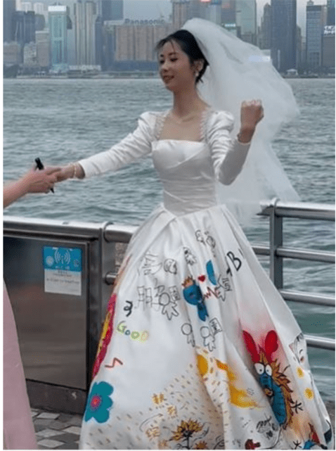 近日,有內地網民在社交平臺小紅書發文,分享在維港遇見穿著特別婚紗的新娘,直言是“看到了幸福的具象化”!該新娘身穿一襲白色長裙款式婚紗,下半身的裙上畫滿色彩繽紛的手繪圖案,包括有可愛的貓、太陽花、卡通版的龍、飛天豬等等,看上去充滿童趣與繽紛的藝術氣息。 除此之外,新娘的賓客們更可以即場在婚紗裙上留下親筆簽名、畫畫等,賓客們紛紛成為創作婚紗的一份子,令整個結婚過程份外深刻、非常有紀念價值!