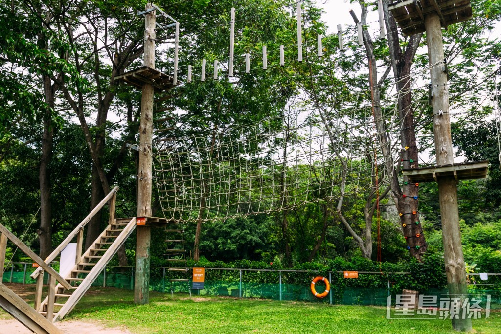 嘆完美食后不妨到高空繩網區活動一下!營地設有繩網陣,分為13個關卡,最高難度達8米高。 今次記者挑戰4米難度,穿上裝備后教練會逐步指導過關技巧,看起來容易,但實際十分講究核心平衡及體力,而且離地略高,挑戰時需要非常專注,自問不畏高又夠膽不妨挑戰!