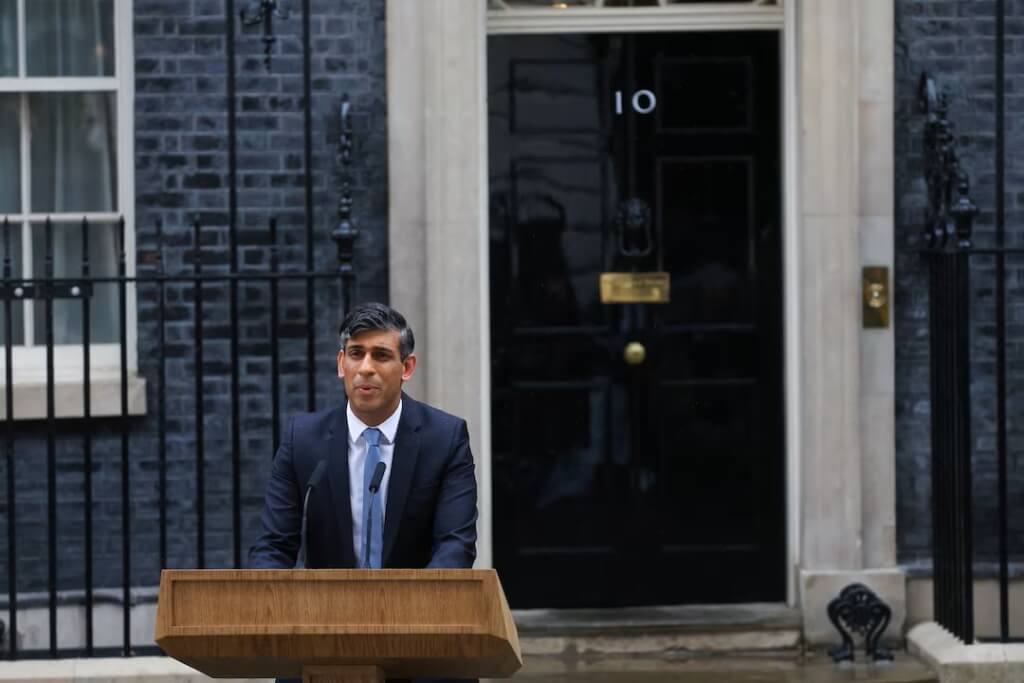 路透社報道,蘇納克(Rishi Sunak)站在英國首相官邸唐寧街(Downing Street)外淋著雨,宣布將提前舉行國會大選,這被為一項冒險策略,因為他所屬的保守黨民調遠遠落后工黨。