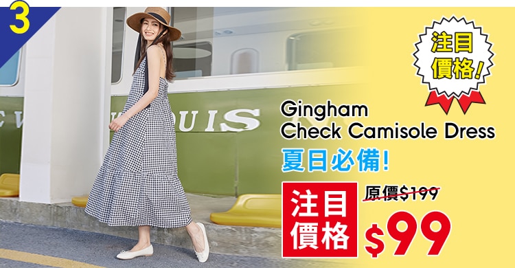 必搶的女裝款式包括:吊帶連身長裙Gingham Check Camisole Dress系列(原價$199,折后只售$99)