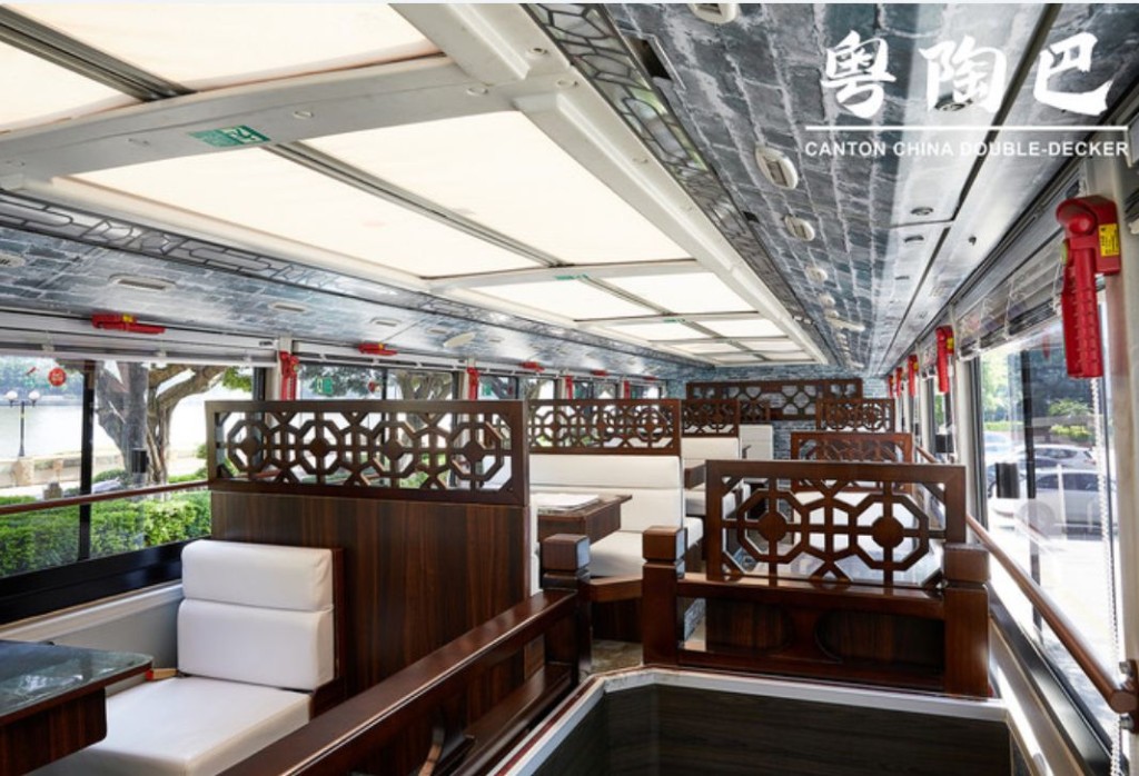 觀光巴士內部經過改裝,裝潢以西關建筑為主題,車內設置卡位座椅,可供2至5人一桌,座椅采用漆木木雕設計,風格典雅古樸,窗簾印有特色玻璃窗“滿洲窗”圖案,充滿廣式風情,打卡一流。
