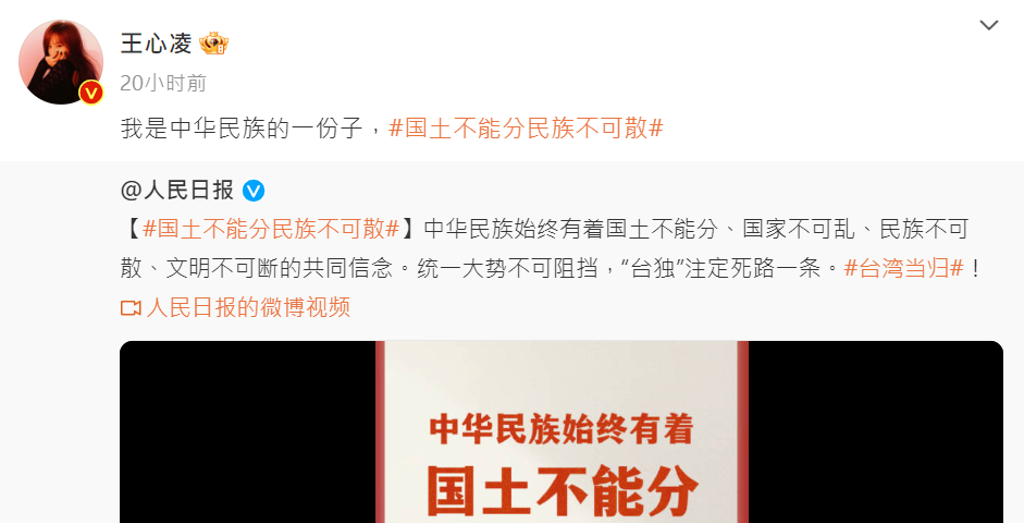 王心凌昨下午亦轉發《人民日報》聲明,表示:“我是中華民族的一份子”,認同國土不能分、民族不可散的理念,王心凌所屬工作室也同步轉發。今早,關鍵字“王心凌 我是中華民族的一份子”登上微博熱搜冠軍,目前已有八萬多人按贊,持續發酵中。
