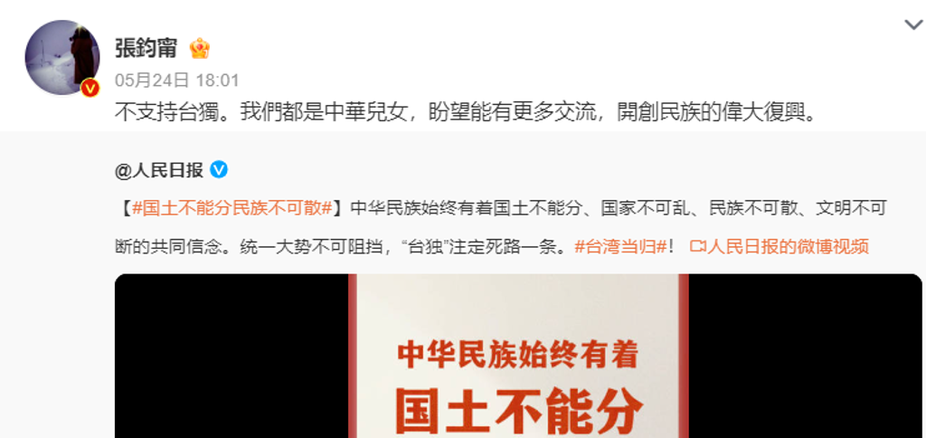 臺灣氣質女星張鈞甯,也在昨日晚間轉發《人民日報》聲明,寫下:“不支持臺獨。我們都是中華兒女,盼望能有更多交流,開創民族的偉大復興?!睆堚x甯這則貼文,討論度超高,也進微博熱搜,目前已有七萬多人按贊。