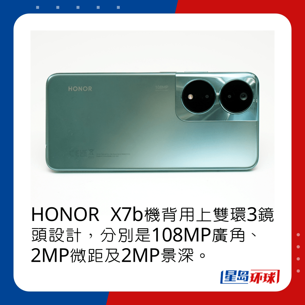說到影拍,HONOR X7b跟大部分入門機款一樣,除了廣角主鏡,另外2顆分別2MP微距及2MP景深,不過主鏡還是用上1億像素感光組件,且支持高像素模式直出108MP相片,同時提供2倍及10倍數碼變焦,至于前置自拍為8MP。值得留意的是,此機不支持NFC,即不能用上Google Pay等感應式電子支付。