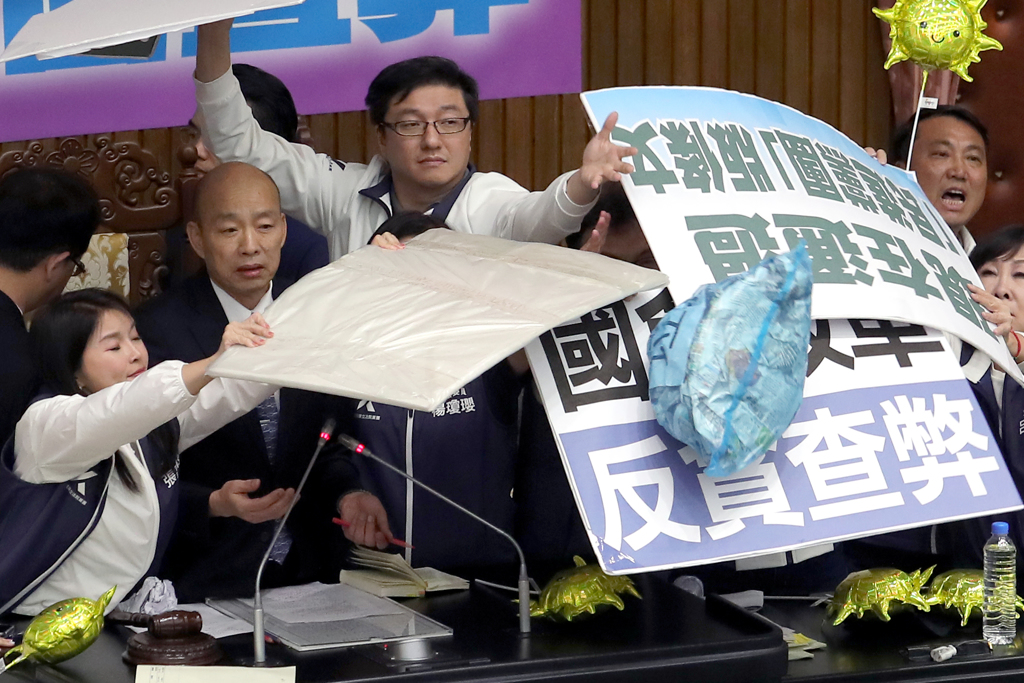 ▲臺灣立法機構院會28日續審“國會改革”相關法案,進入三讀程序時,民進黨“立委”將寫上“垃圾”字樣的藍色塑料袋丟上主席臺抗議,國民黨“立委”們舉起牌子阻擋,保護立法機構負責人韓國瑜(左二)。(來源:中時)