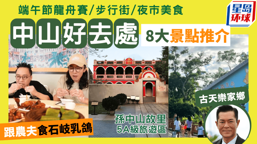 中山是粵港澳大灣區城市之一,與廣州、佛山、江門、珠海為鄰,是香港人探親、旅游好去處。中山景點有國家5A級旅游景區孫中山故里旅游區,包含歷史、文化、玩樂等元素,而近期主演賣座電影《九龍城寨之圍城》的古天樂也是原籍中山,古天樂家鄉是個小規模生態旅游區。端午節快到,大型龍舟文化活動帶來一番熱鬧,還有吃地道美食,不要錯過C君、陸永推薦的石岐乳鴿,這樣的中山旅程才夠圓滿。