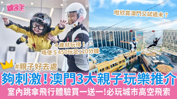 下星期就有3天端午假期,在這個長周末不如就帶剛考試完畢的孩子去澳門玩番轉,紓緩一下考試壓力,釋放緊張心情! 除了到各名勝古跡游覽,或到室內游樂場放電,也可帶孩子去試玩一些新奇刺激的玩意,就如室內跳傘體驗及飛行訓練,或是世界首個沉浸式城市高空飛索,即睇3大澳門親子玩樂推介與優惠詳情,即刻買飛出發。