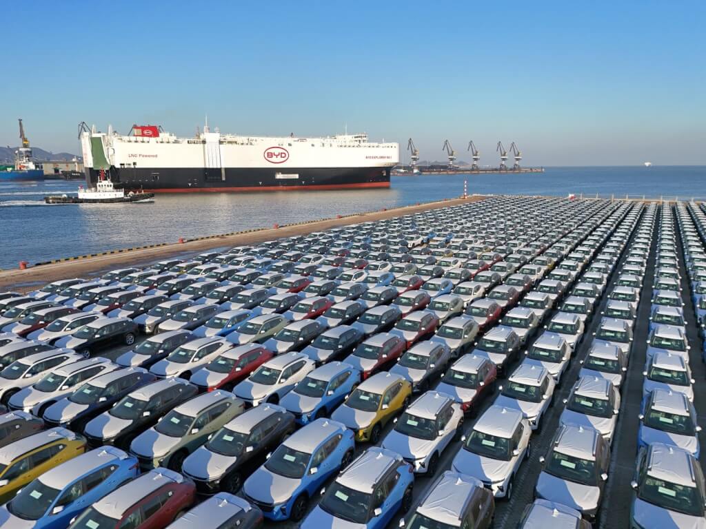 山東煙臺港的比亞迪貨船和準備出口的電動車。
