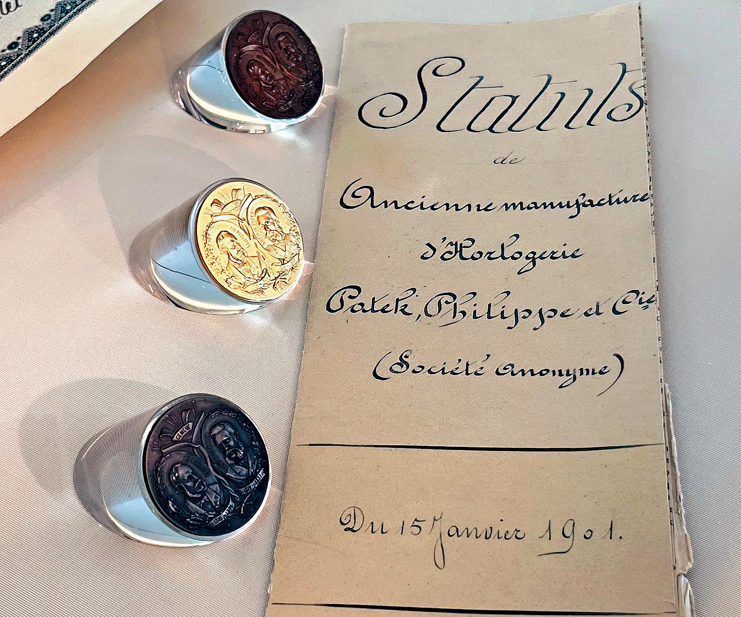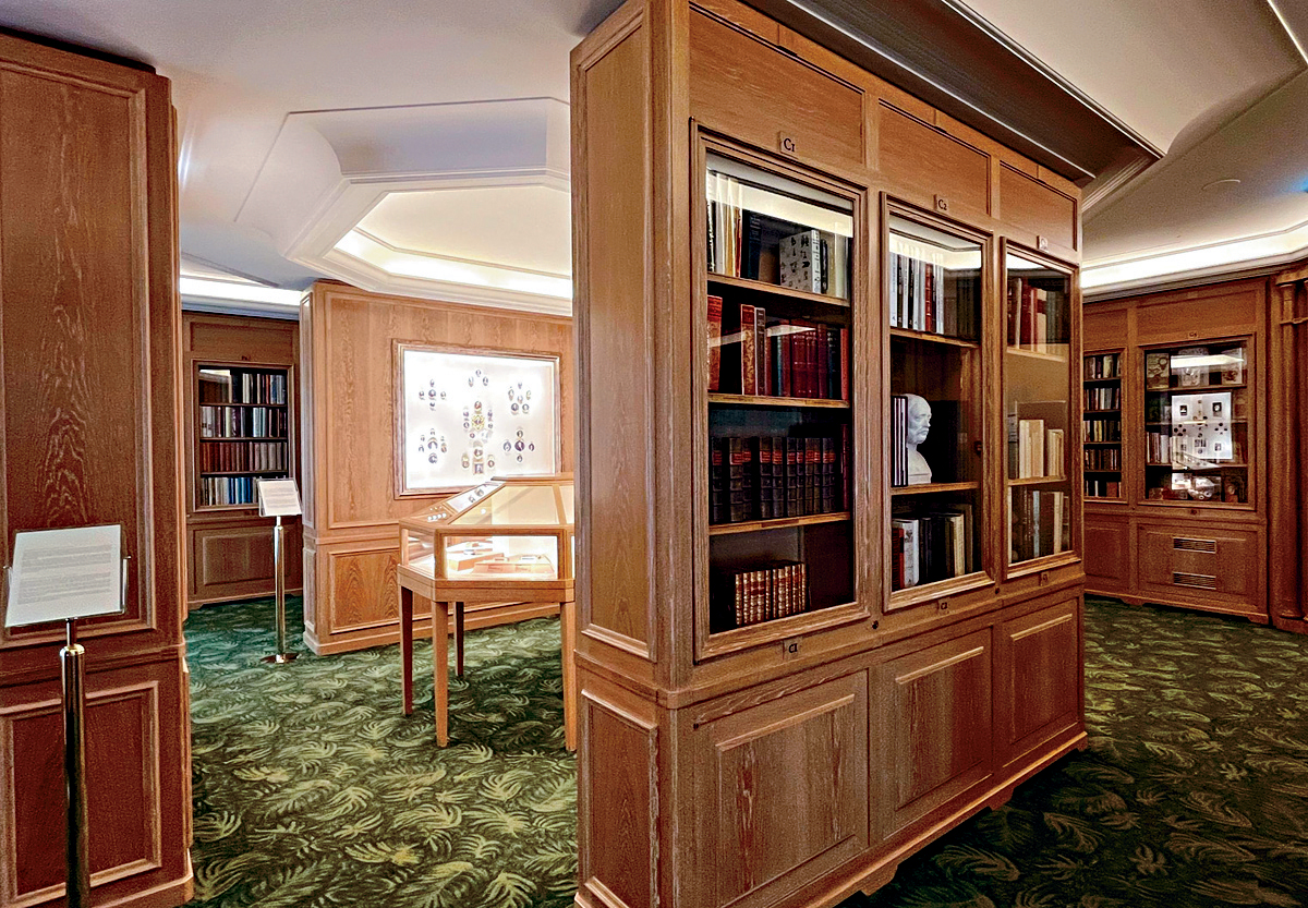 乘電梯直上4樓,就是品牌歷史數據庫及圖書室,當中收藏了8,000多本有關鐘表及相關主題的書籍,并展示珍貴的微繪琺瑯肖像及鼻煙盒等歷史藏品。同層特辟一角重現Henry Stern,亦即現任總裁Thierry Stern的祖父的昔日辦公室情景。參觀者更可欣賞到特別為慶祝品牌榮譽總裁Philippe Stern的85歲生辰而推出的1938P-001三問及響報時間功能腕表。展品中亦可見到歷史數據庫中的珍貴文件,以及創辦人Antoine Norbert de Patek與Jean Adrien Philippe的手稿等。