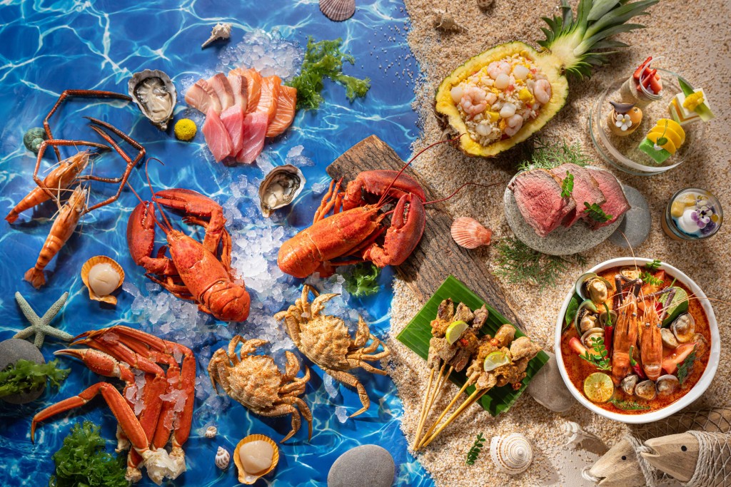 而自助晚餐同樣有生蠔、鱈場蟹腳,更會于平日限定推出波士頓龍蝦,周末推出蒸新鮮龍蝦、叄峇芒果魷魚沙律,再嘆個清涼馬來西亞蔬果沙律、羅望子汁青木瓜沙律,來串雜錦沙嗲串與脆炸米網素春卷,還有炸香蕉、士多啤梨茴香朱古力卷蛋糕、咖泱焦糖燉蛋,實在“泰”嘆?,F在酒店更推出3小時泳池通行證連自助晚餐,可于預約時段玩水消暑,沖個涼再到餐廳嘆自助晚餐,絕對夠chill。
