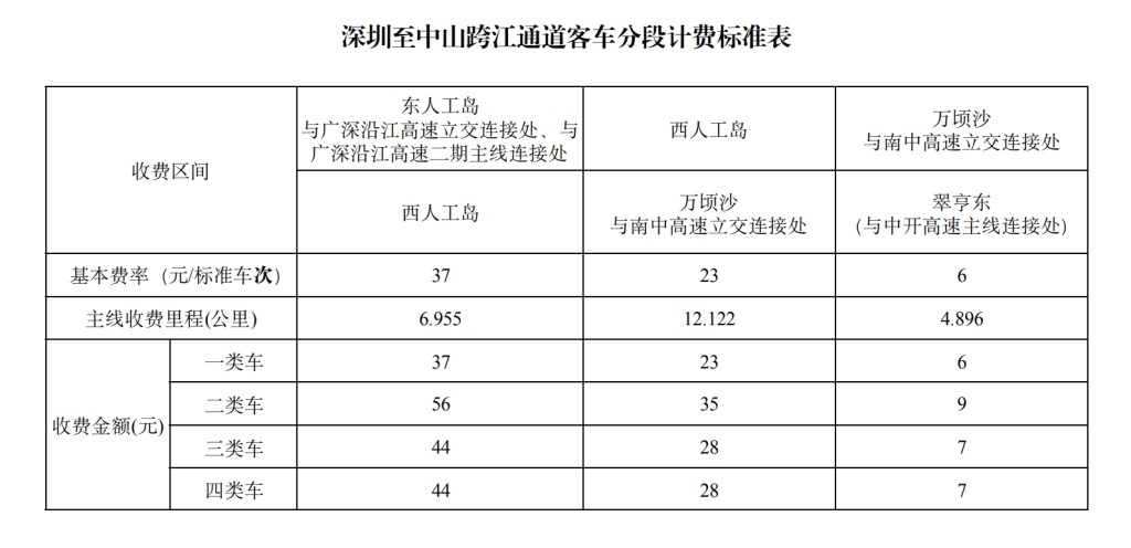 西人工島至萬頃沙樞紐互通的收費標準為23元/標準車次。