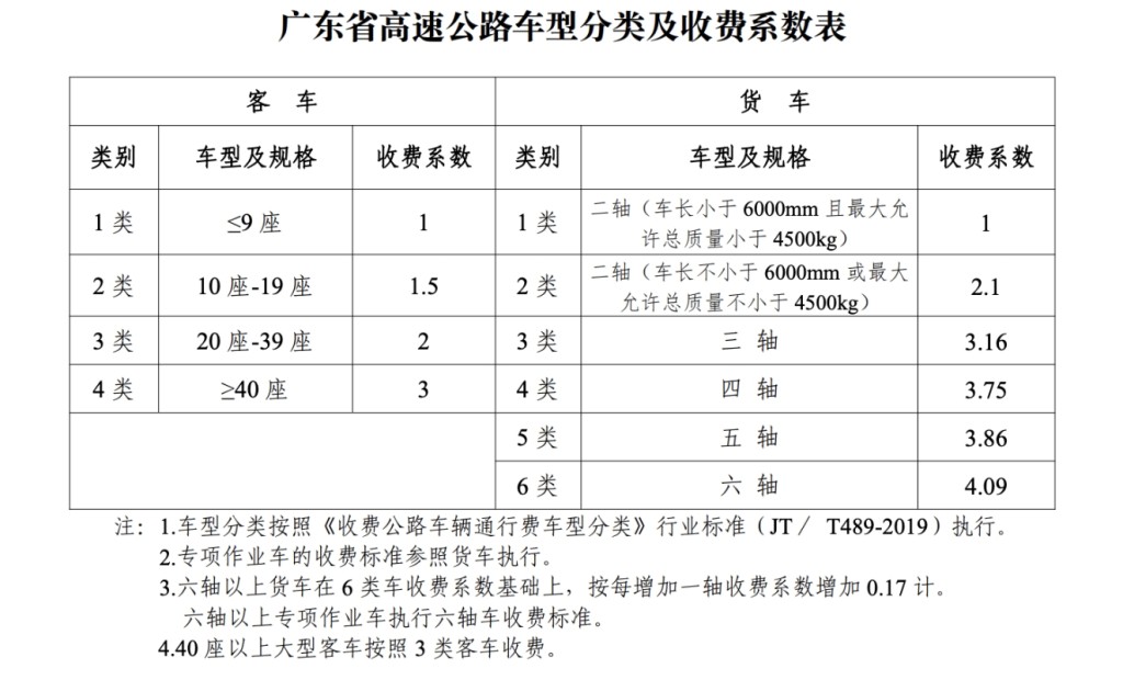 1至4類客車的收費係數分別為1、1.5、2、3,其中3類客車、4類客車收費係數按前述係數的60%執行;1至6類貨車的收費係數分別為1、2.1、3.16、3.75、3.86、4.09,專項作業車的收費標準參照貨車執行。