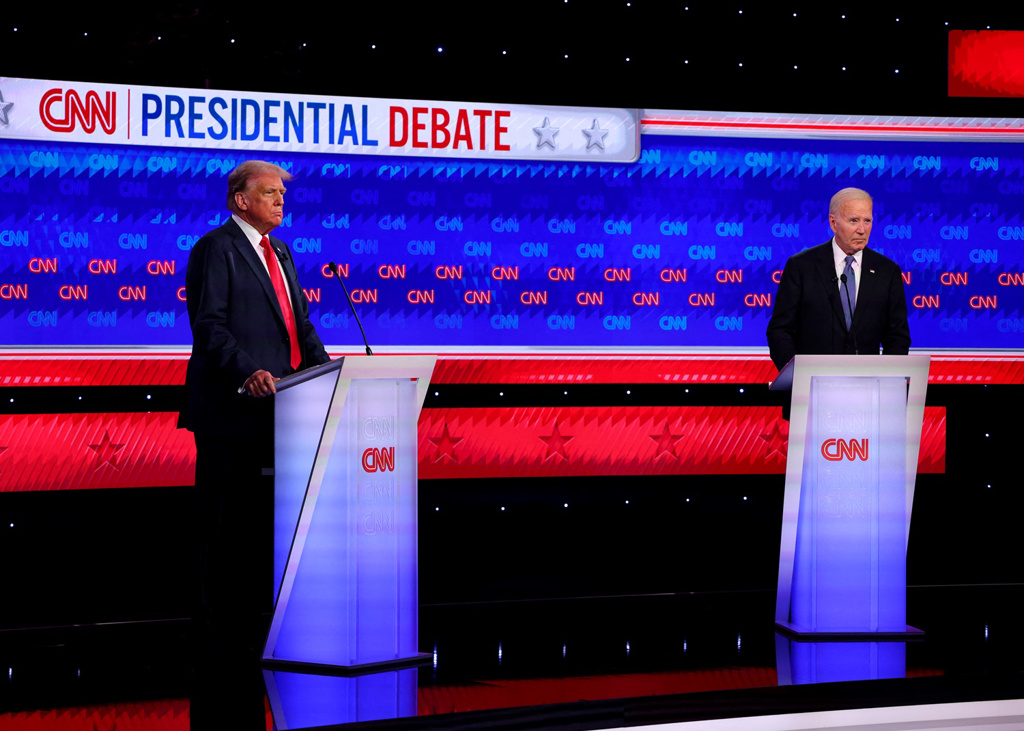 美國現任總統拜登27日和前任總統川普在亞特蘭大舉行首場大選電視辯論。(路透)