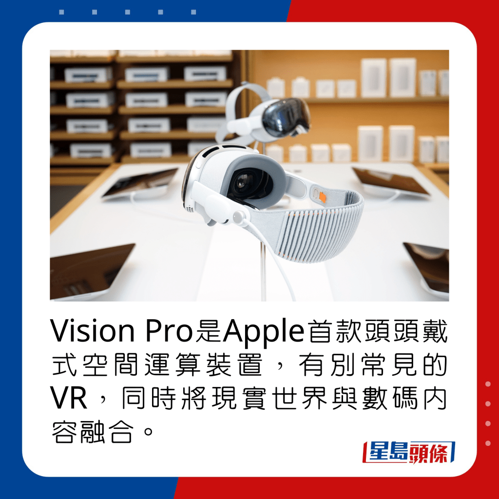 Vision Pro是Apple首款頭頭戴式空間運算裝置,有別常見的VR,同時將現實世界與數碼內容融合。
