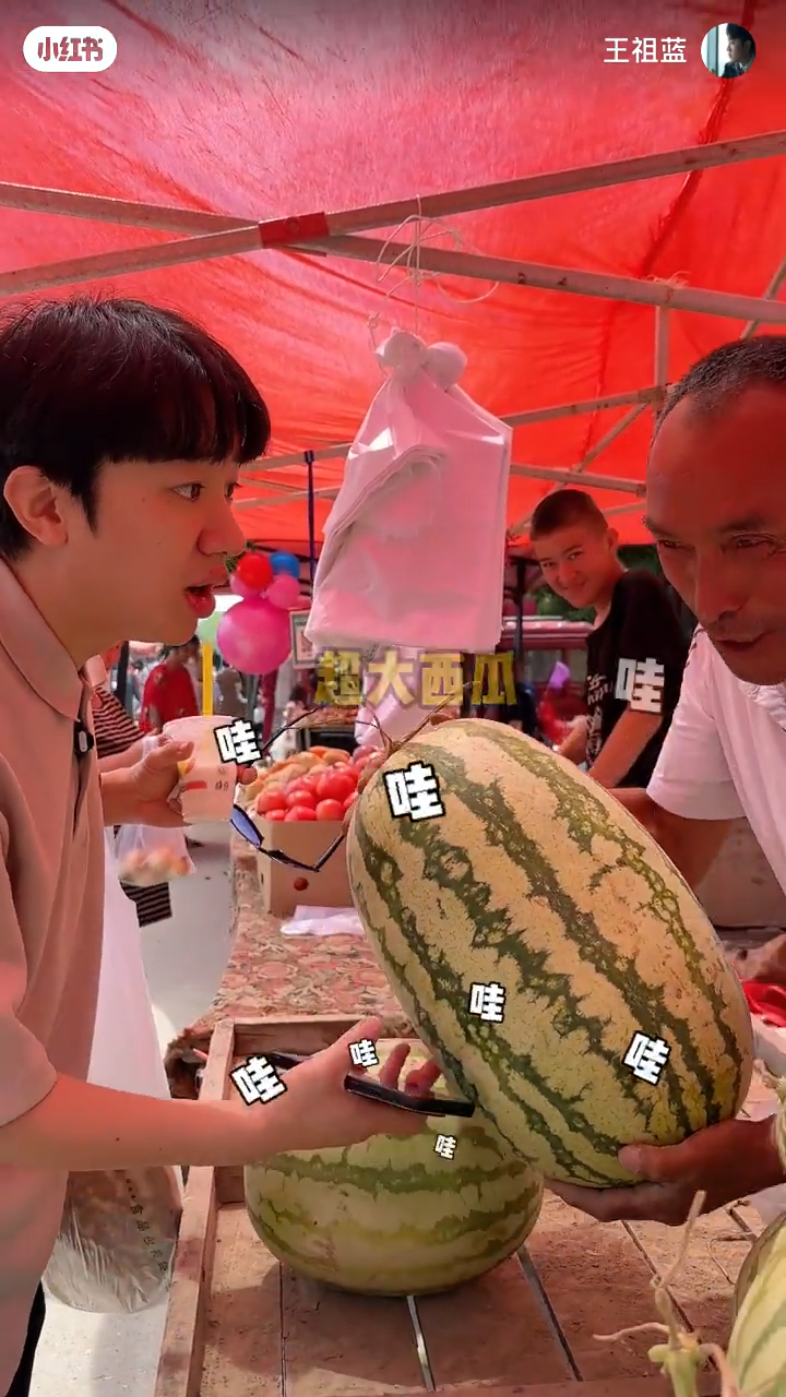 最后他們吃過涼拌面后找飯后果,他找了一個有3個手掌大的西瓜,西瓜1公斤1元,檔主告訴王祖藍大的西瓜是8元時,他興奮得走音說:“8塊錢一個大西瓜”,巨大西瓜都只是15塊”,王祖藍買了一個巨大西瓜,吃下兩口,樣子都變埋,驚嘆:“真的好甜吶!”