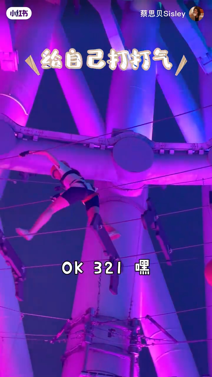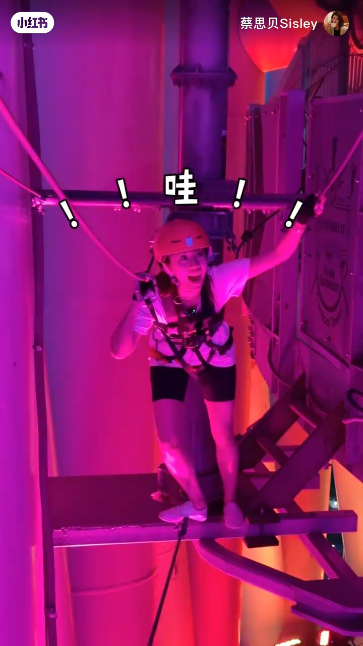 蔡思貝日前在小紅書以“解鎖新高度,廣州夜景實在是太美了!”為題發帖,影片介紹到298米高的廣州塔游玩,臨出發蔡思貝更自信滿滿地說:“應該沒有難度吧!當然沒有難度了,完全沒有難度??!我不怕的!”蔡思貝所玩的刺激活動是廣州塔阿爾法探索樂園,她準備好就佩戴上安全頭盔,開始前她先在寫上“296m凌空探險/紅線”的海報前打卡然后出發,她在高空踏出第一步時已不停尖叫,之后懸空踩鋼絲更貪玩地在半空扮跳芭蕾舞,她邊玩邊分享:“其實真的會腳軟,剛剛過了第一關啦!繼續gogogo”。第二關蔡思貝玩的是是飛蕩藤椅,她一度因為設施不斷搖晃而更感刺激。