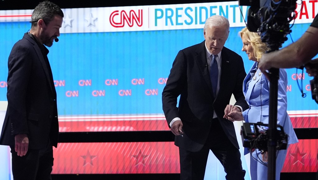 拜登在完成辯論后,被妻子小心扶下只有一級樓梯的講臺。 美媒認為,此顯示他身體不太受控制。 美聯社