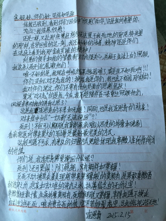 ▲連恩青給家人的信中表示對死刑沒有懼怕,反而感覺是榮耀和期待。