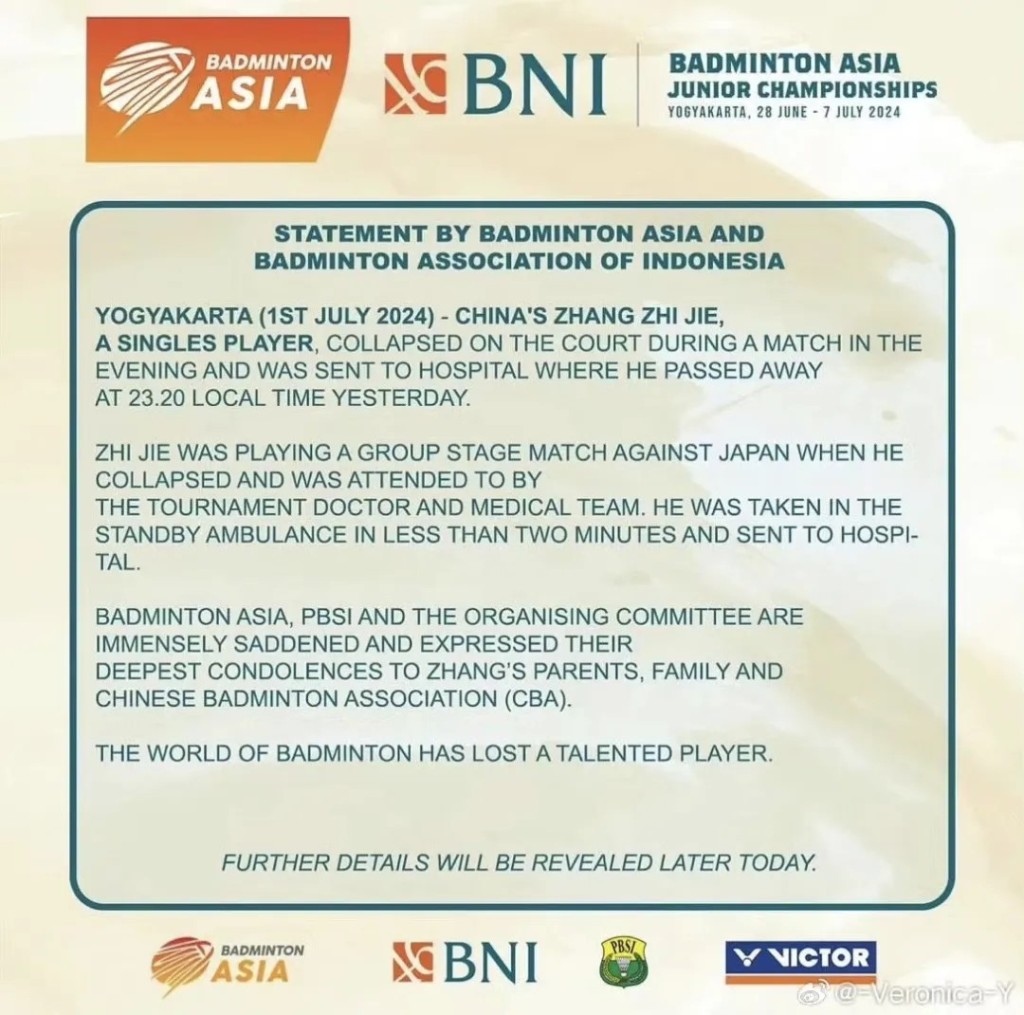 亞洲羽毛球聯合會及印尼羽協就張志杰猝死發公告。