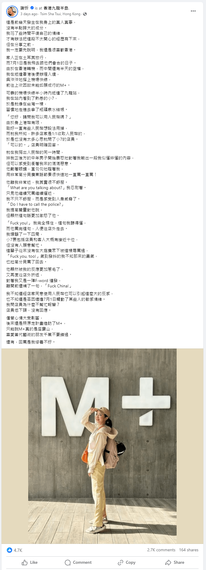 謝忻昨日(7日)在fb貼出一張在維港海旁的自拍照,同時撰文向香港人道歉:“我把前一篇文章換成了M+的照片,記錄我去了M+,如果有RMB的那張照片讓任何的香港朋友感到不適,我道歉,鄭重道歉?!敝x忻坦言照片并非事發時所攝:“那張照片不是事前拍的,當然更不是事發當時拍的,是已經造訪完M+后,準備搭機鐵回機場前又路經那家小7才拍的。為什么拿著RMB拍?因為這一生從沒這樣被陌生人當眾用F-word辱罵過,想跟元兇合拍一張,跟多數人拍照的原因一樣,單純就是想留個記錄?!?/p>