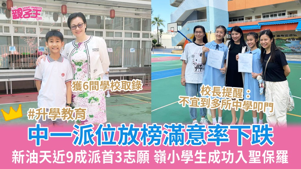 中一派位2024今日(9日)發榜,小六學生需回校取結果,并于本周四或五前往獲派中學注冊。教育局表示,中一自行分配學位及統一派位階段獲派首三志愿學校的學生人數合計,整體滿意率為91%,與去年一樣;獲派首志愿學校的學生人數計算,滿意率79%,較去年微跌一個百分點。