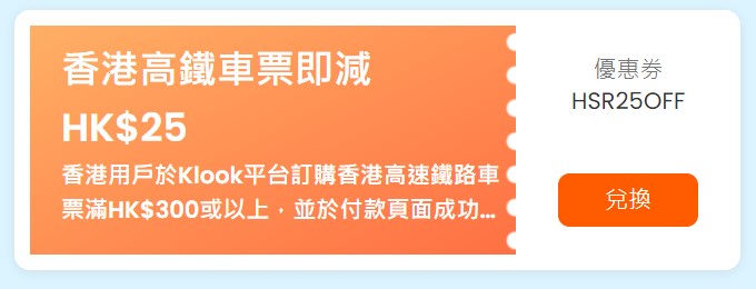 此外,可享用戶訂購香港高鐵車票滿$300或以上,并在付款頁面輸入【HSR25OFF】優惠碼,可享$25的即時折扣優惠