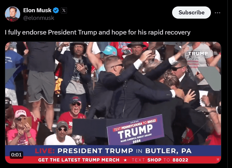 • 特朗普遭槍擊后,馬斯克表態支持任總統,稱強硬如羅斯福