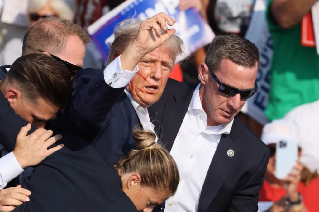 美國前總統特朗普13日出席賓州造勢活動傳槍響,特朗普臉側及耳朵冒血。路透社