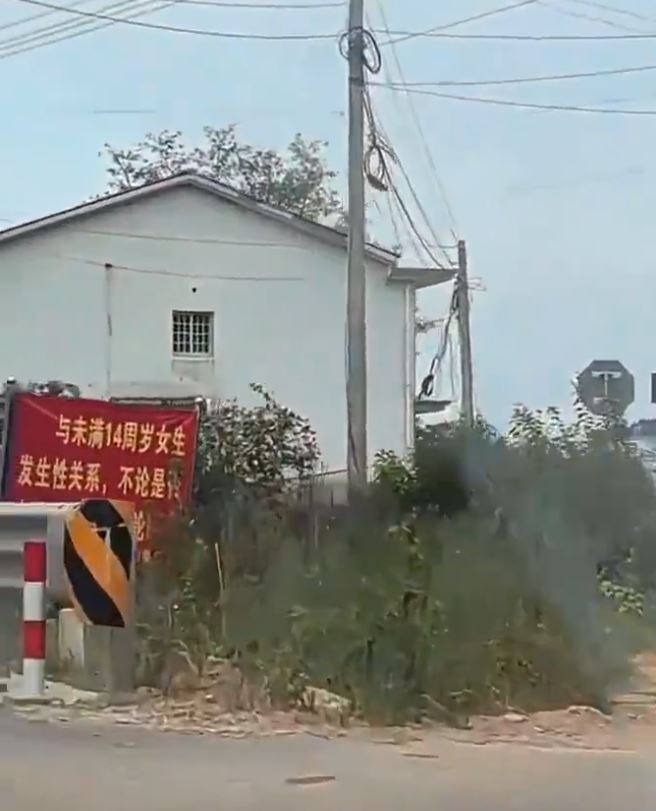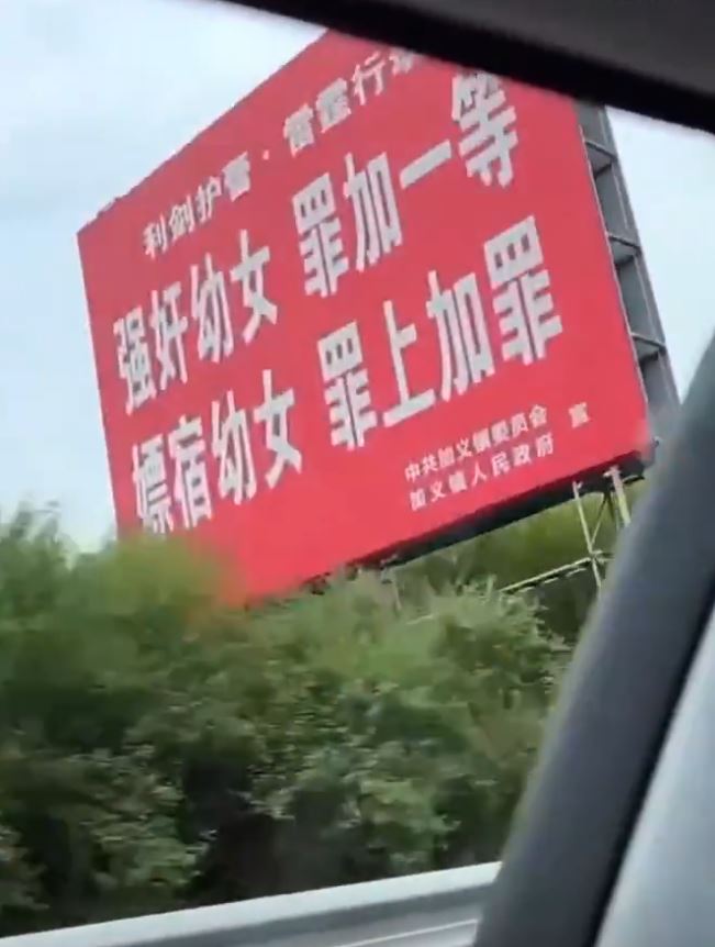 內地一名男網民,日前上載短片到微博,指有男司機在12日,駛經岳陽市平江縣加義鎮時,留意到路邊的標語警句,內容全部與“強奸幼女”有關,標語內容包括““與未滿14周歲女生發生性關系,不論是否自愿,以強奸罪論!”、“強奸幼女,罪加一等,嫖宿幼女,罪上加罪”、“強奸猥褻未成年人,三年以上,直至死刑”等。