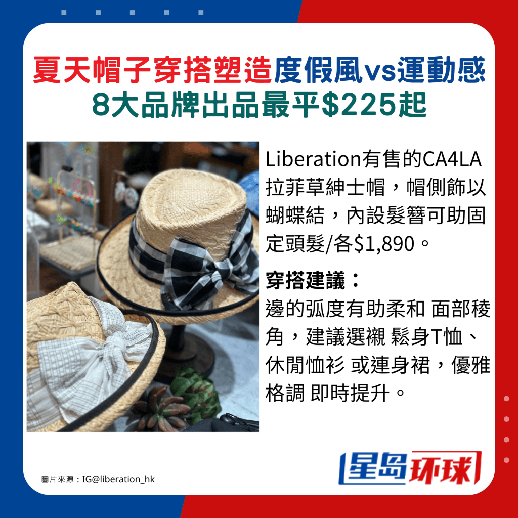 對抗盛夏艷陽天,穿搭少不 了一頂既可防曬又可豐富造型的帽子。草帽、棒球帽及遮陽帽款皆屬今季熱選,只要悉心穿搭, 就可塑造迎合季節的度假風或運動休閑造型。各品牌的新作中,可見撞色混搭、鏤空細節與女性化裝飾等流行元素,若再留意面形與衣裝配襯,更可進一步提升你的專屬形象。