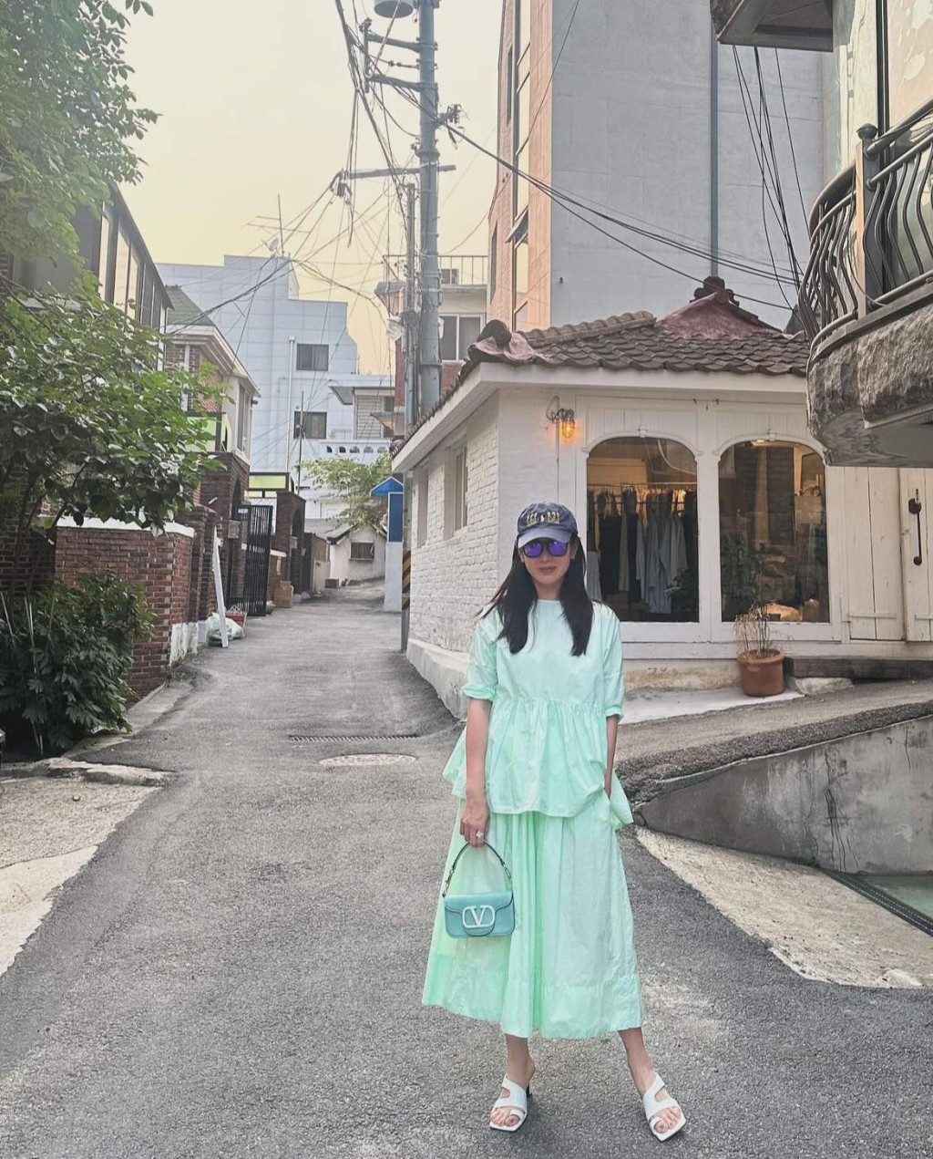 ▲韓星孫藝珍以薄荷綠色衣裙,配襯棒球帽及高跟涼鞋,塑造動靜兼備的時尚造型。(圖片來源:IG@yejinhand)