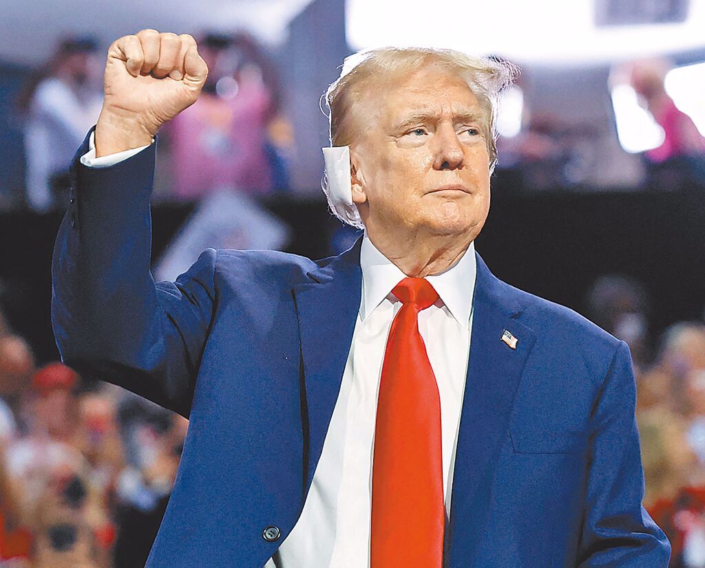 ▲前美國總統特朗普15日在共和黨全國代表大會,舉起代表“戰斗”的拳頭手勢。(路透)