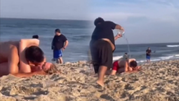 據《每日郵報》報道,近日一段影片在網上爆紅,美國一對情侶在眾目睽睽之下,旁若無人地躺在沙灘上熱吻交纏,惹附近游客反感。其中一名身穿深藍色T恤的少年忍無可忍,直接拿著一大瓶水上前澆向兩人,試圖制止他們的行為。