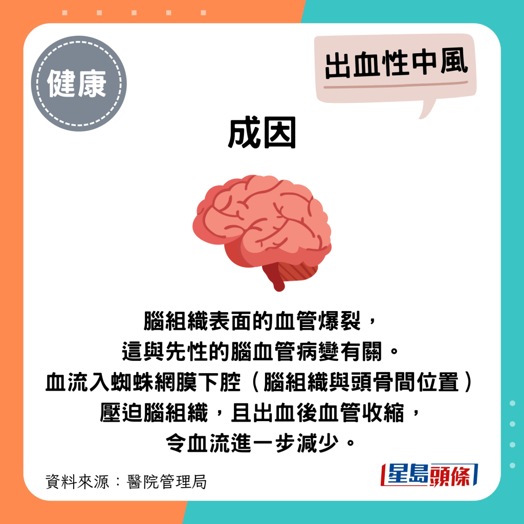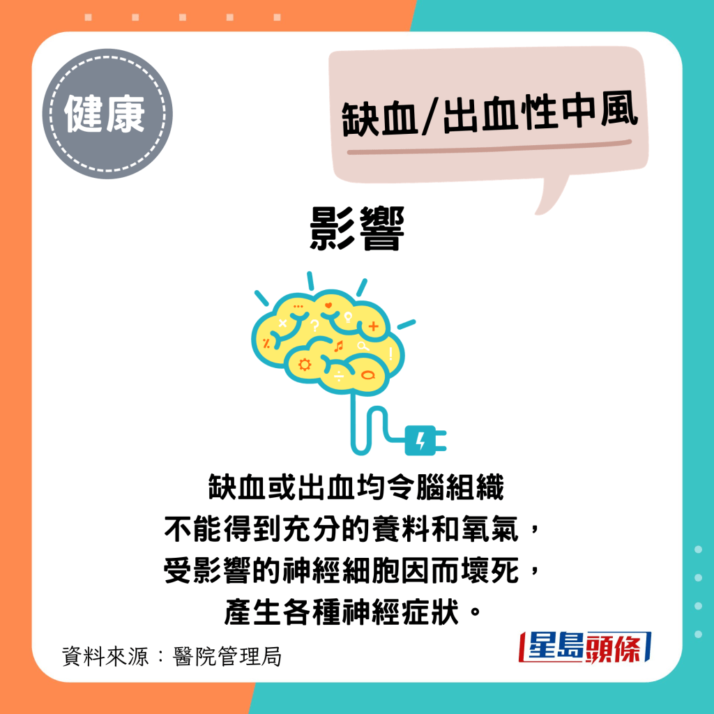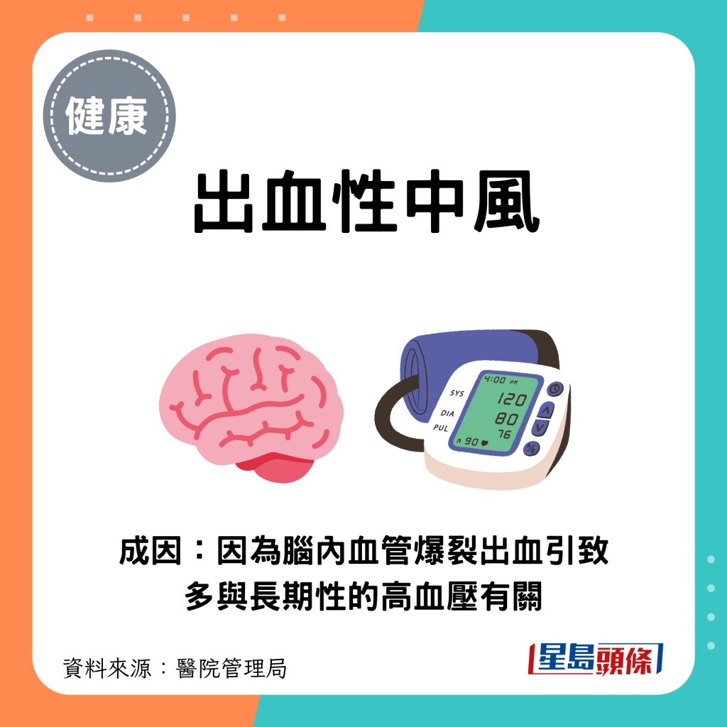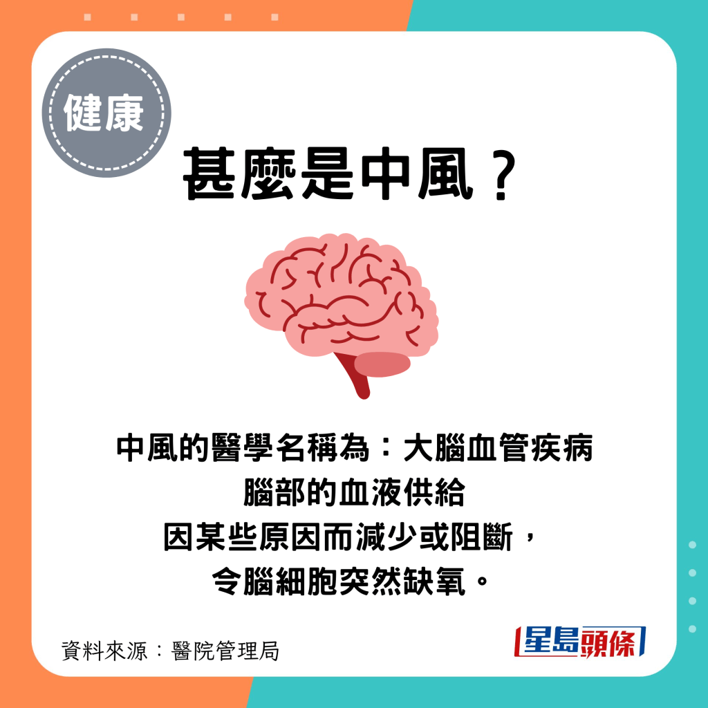 衛生署指出,“中風”即是“腦血管意外”,是由于腦部血管“阻塞”或“爆裂”,令腦組織不能得到充份的養料和氧氣,受影響的神經細胞因而壞死,產生各種神經癥狀。