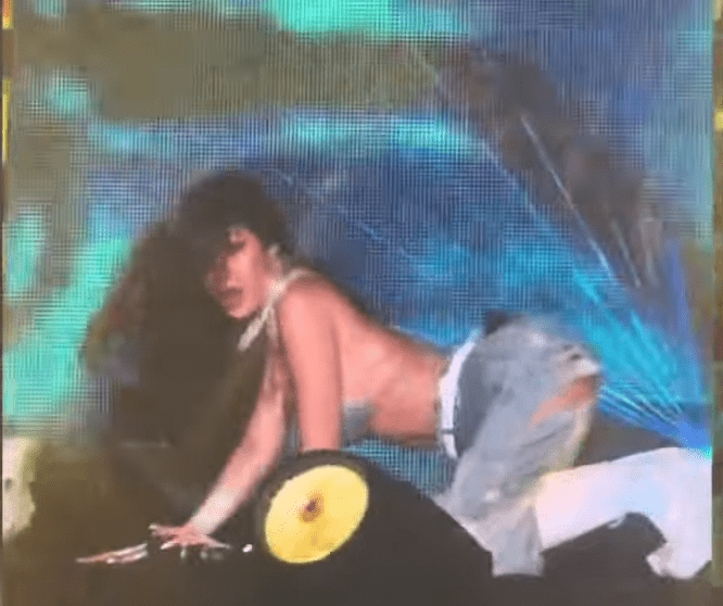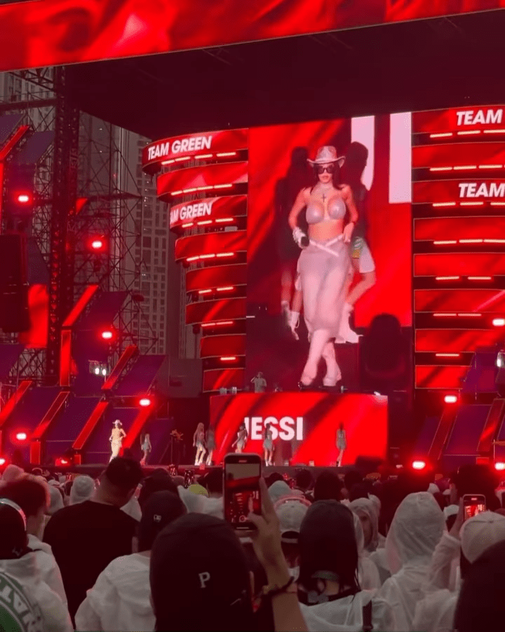 Jessi當日身穿銀色比基尼上衣,搭配帥氣牛仔長褲,而她的傲人上圍將薄薄的比基尼罩杯撐得超緊,當天Jessi演唱《Gum》時一度太嗨,雙膝跪地熱烈扭腰時,豈料比基尼跟著她的舞蹈動作移位,加上她沒有做好安全措施,整顆渾圓直接露出,而且剛當時好鏡頭正是特寫,因此露點畫面兩側大螢幕全部播出,雖然幾秒后她就發現問題趕緊拉好,但也一度慌了手腳。