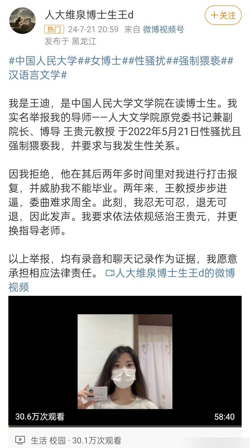 據界面新聞報道,根據網傳視訊顯示,中國人民大學一名在讀文學博士生王迪,實名舉報導師,人大文學院原黨委書記兼副院長、博導王貴元教授,該導師于2022年5月21日性騷擾且強制猥褻,并要求與其發生性關係。