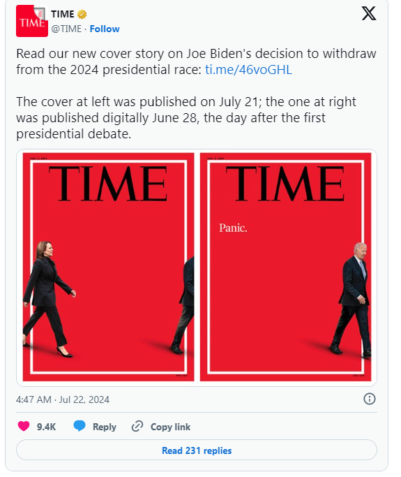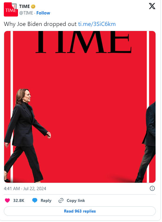 “時代雜志”約是在美東時間21日下午4時30分過后公布新封面,這時距離拜登于當天下午1時46分宣布退選僅約3小時。