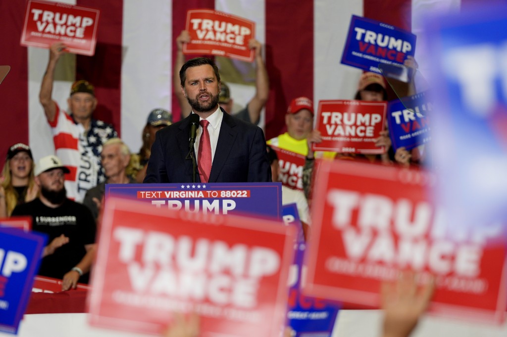 ▲特朗普副手萬斯首次單獨造勢,斥哈里斯比拜登差100萬倍。 美聯社