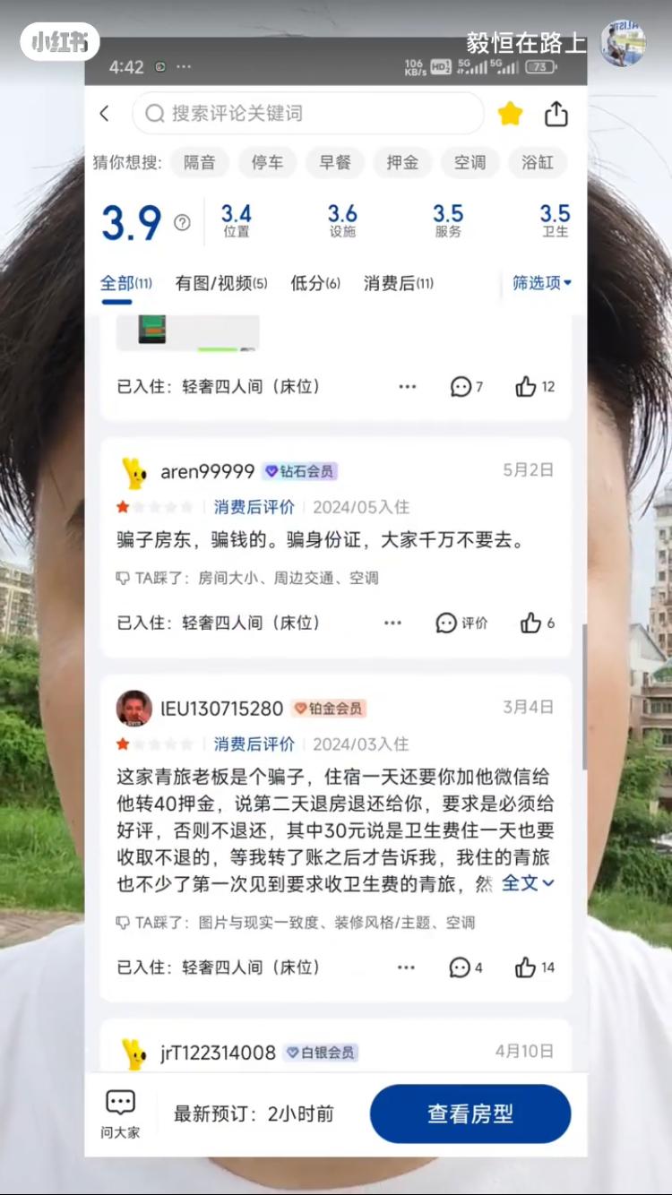 ▲指涉事旅舍沒有營業執照,而且評價里也有很多人留言指被騙了