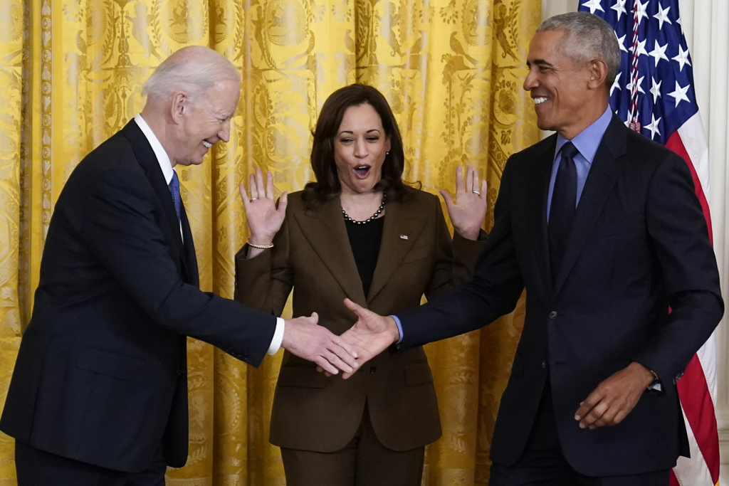 美國前總統奧巴馬(右)2022年4月赴白宮出席活動與總統拜登(左)握手時稱呼拜登為“副總統”,副總統哈里斯(中)露出夸張表情。