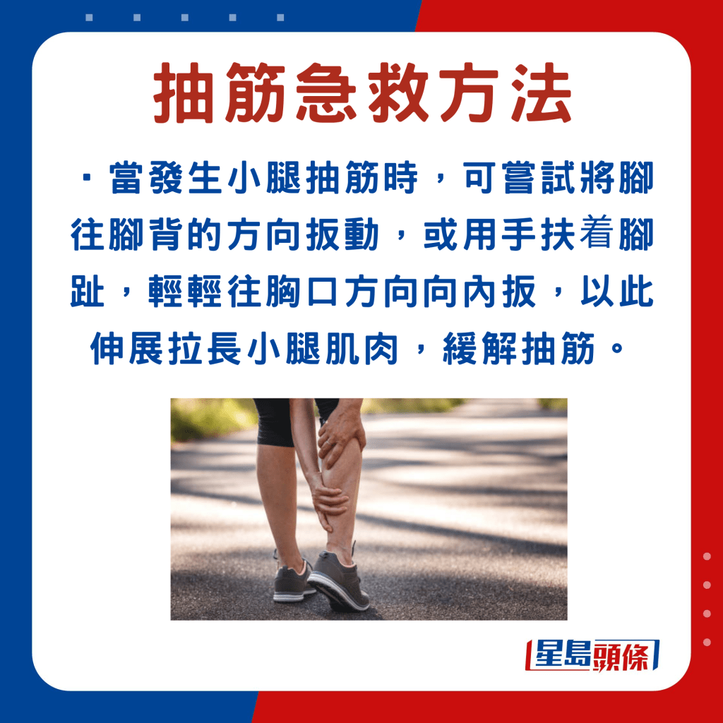 · 紓緩做法:腳往腳背的方向扳動,或用手扶著腳趾,輕輕往胸口方向向內扳,以伸展拉長小腿肌肉。