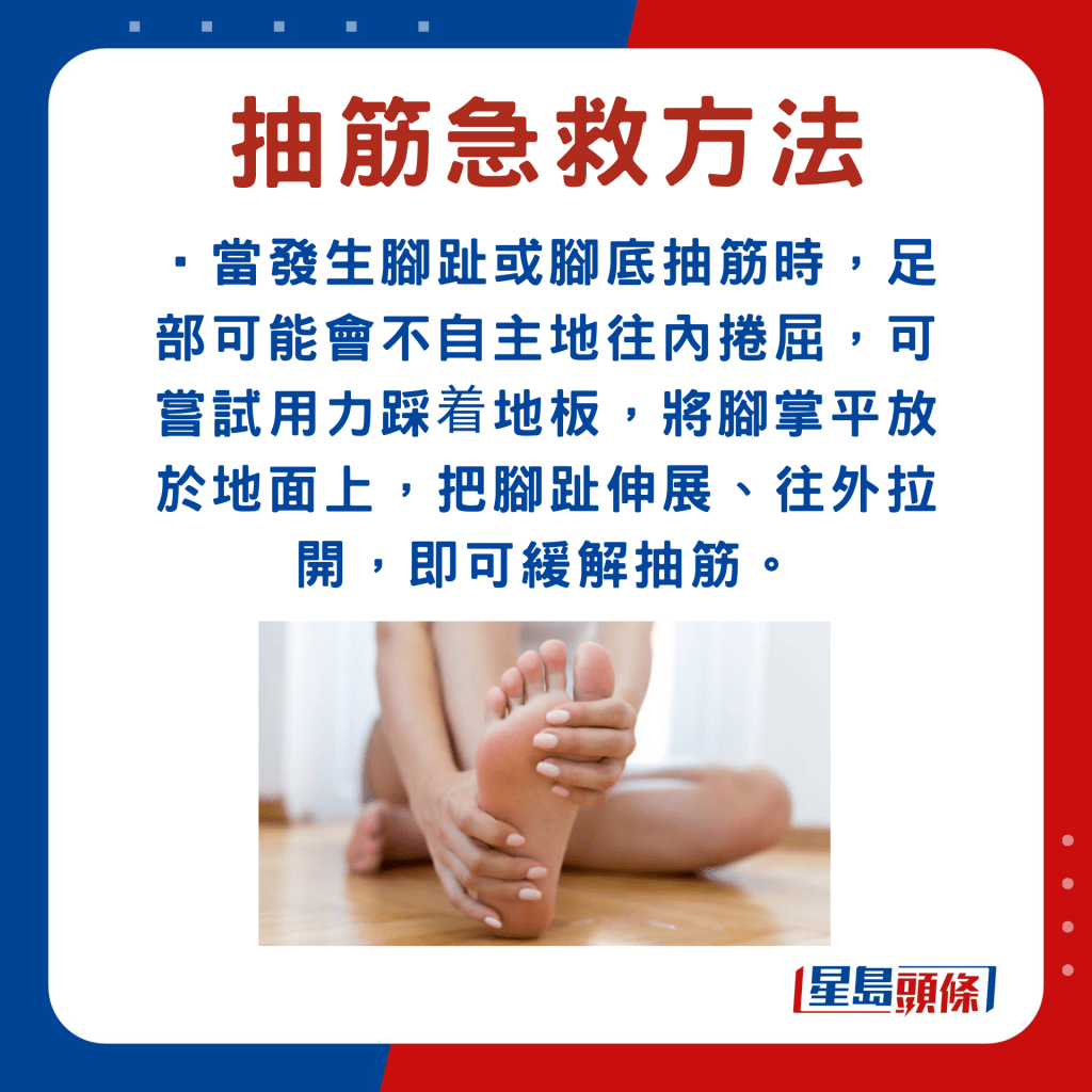 一旦出現抽筋,若不及時虛理或處理方法不當,情況很容易越來越嚴重,尤其腳底、小腿抽筋,更會令人「坐立難安」,甚至寸步難行、無法站立,即使坐著不動亦無法紓緩疼痛及痙攣的肌肉。小腿、腳底、大腿、手臂、手指等部位抽筋,可如何紓緩?張勇醫師指,部位不同,急救方法也不同。