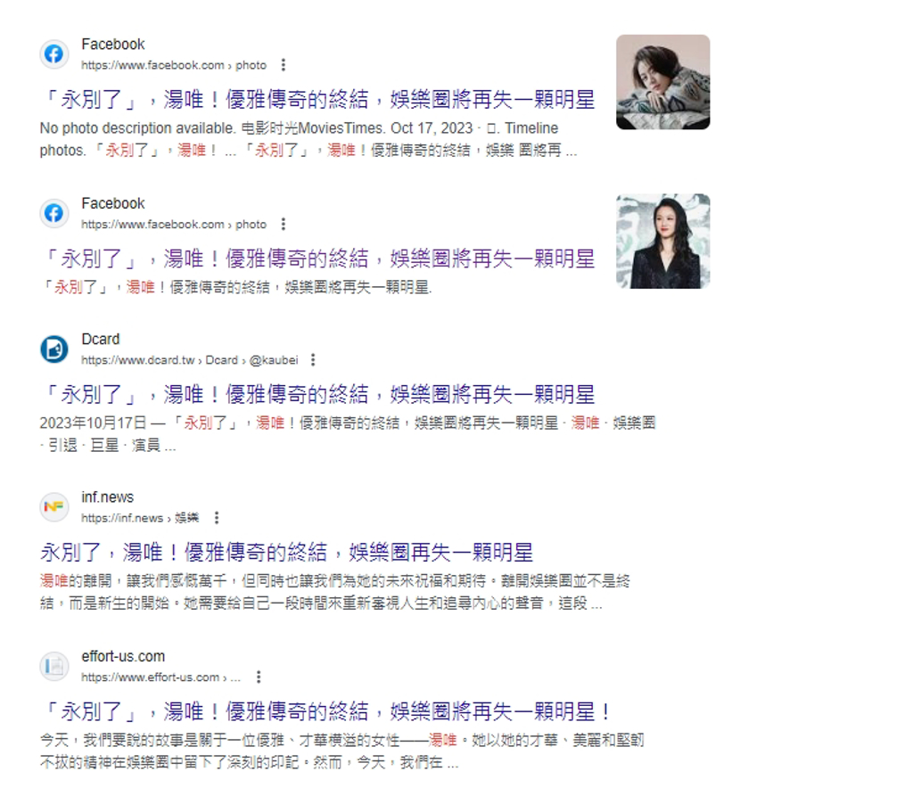 ▲湯唯永別、去世相關搜尋,讓部分網友被誤導。