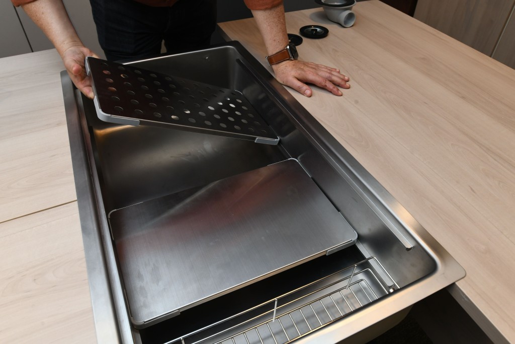 ▲Shigeru日本鋅多功能水槽設有雙層軌道,并有6大配件,包括瀝水板、砧板、功能擴充板、輕巧小型水槽、瀝水籃及洗滌劑網籃。