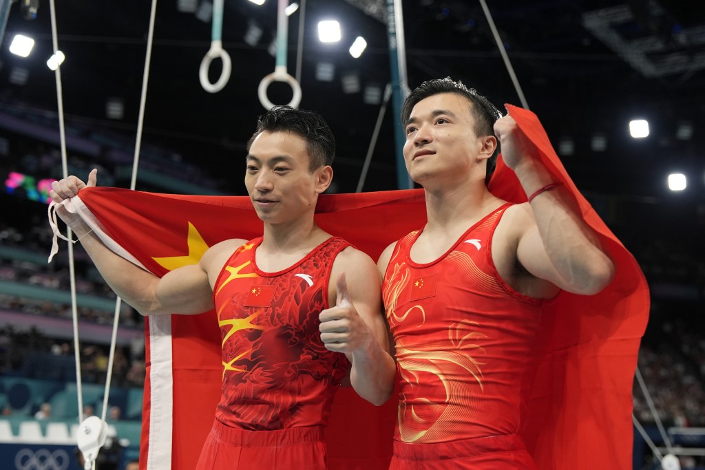 巴黎奧運男子吊環決賽,鄒敬園(左)及劉洋賽后慶祝。