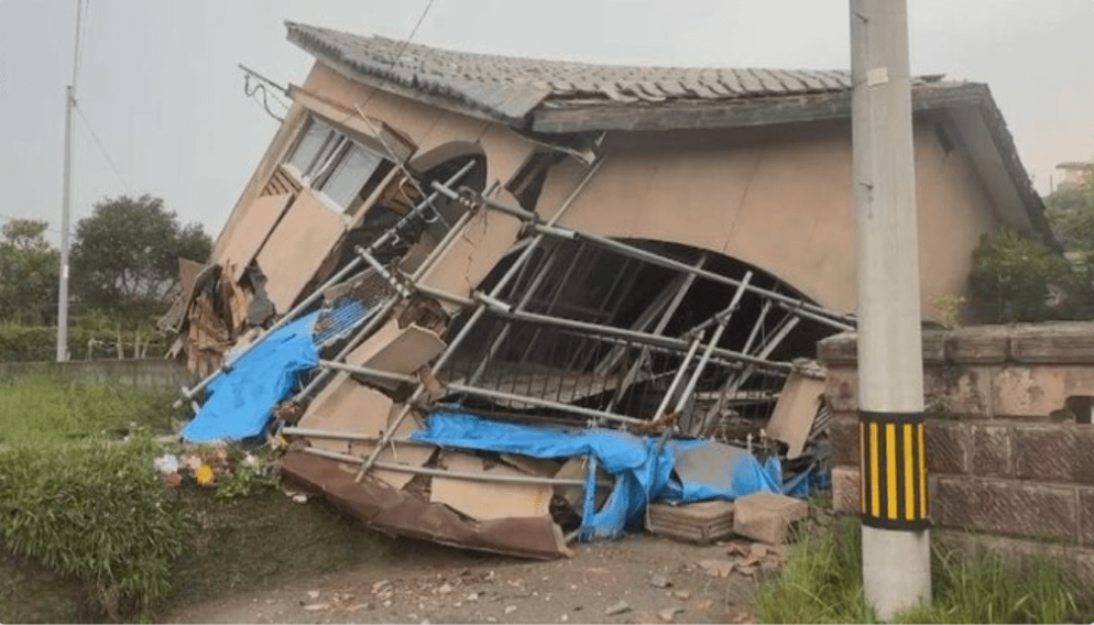 鹿兒島大崎町出現5強以上震度,一幢2層樓高的木造建筑物被震至45度角傾斜倒塌。