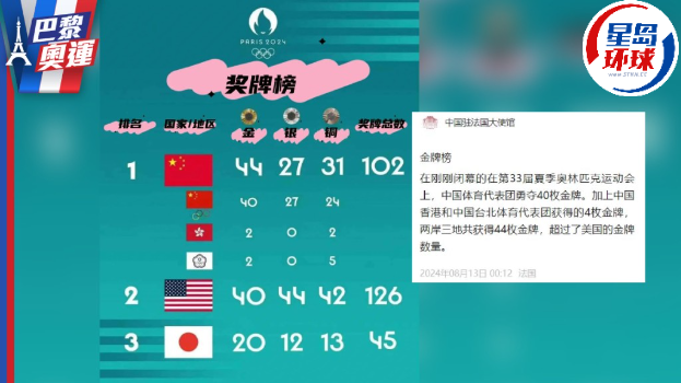 不過,中國駐法國大使館微信公號發文稱:“加上中國香港和中國臺北體育代表團獲得的4枚金牌,兩岸三地共獲得44枚金牌,超過了美國的金牌數量?!?/p>
