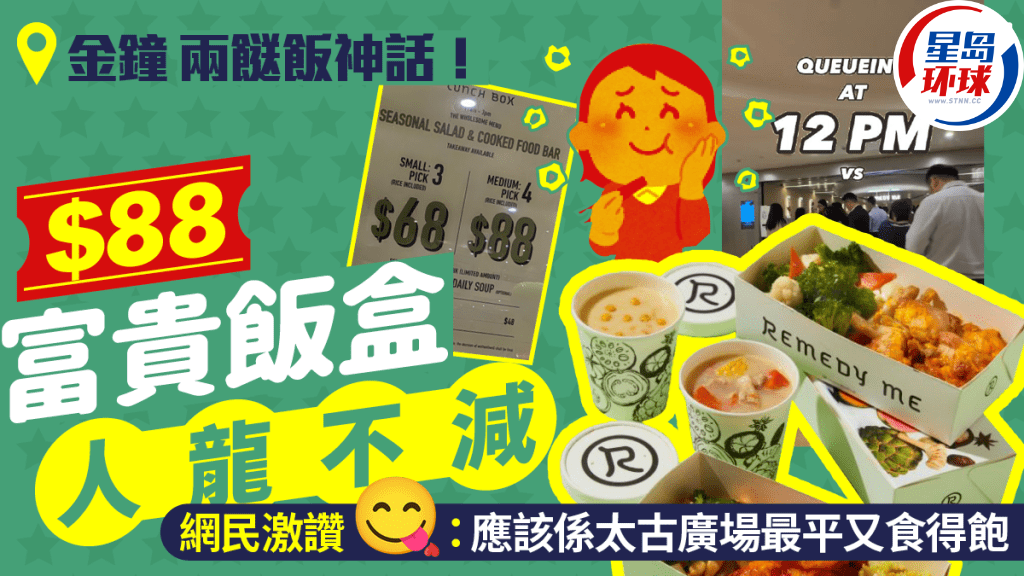 兩餸飯熱潮繼續成為網民熱話,更由平民美食逐漸“升級”成為白領恩物,部分更進軍至一線商場,惹來網民熱議。近日,有網民在社交平臺分享位于金鐘太古廣場的兩餸飯店“Remedy Me”,該店提供的$68三餸飯及$88四餸飯,由價格到餐廳地點俱引發網民的廣泛討論。