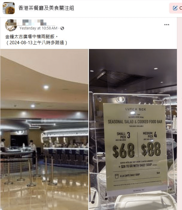 近日有網民在社交平臺分享了金鐘太古廣場開設的一家中檔兩餸飯店“Remedy Me”